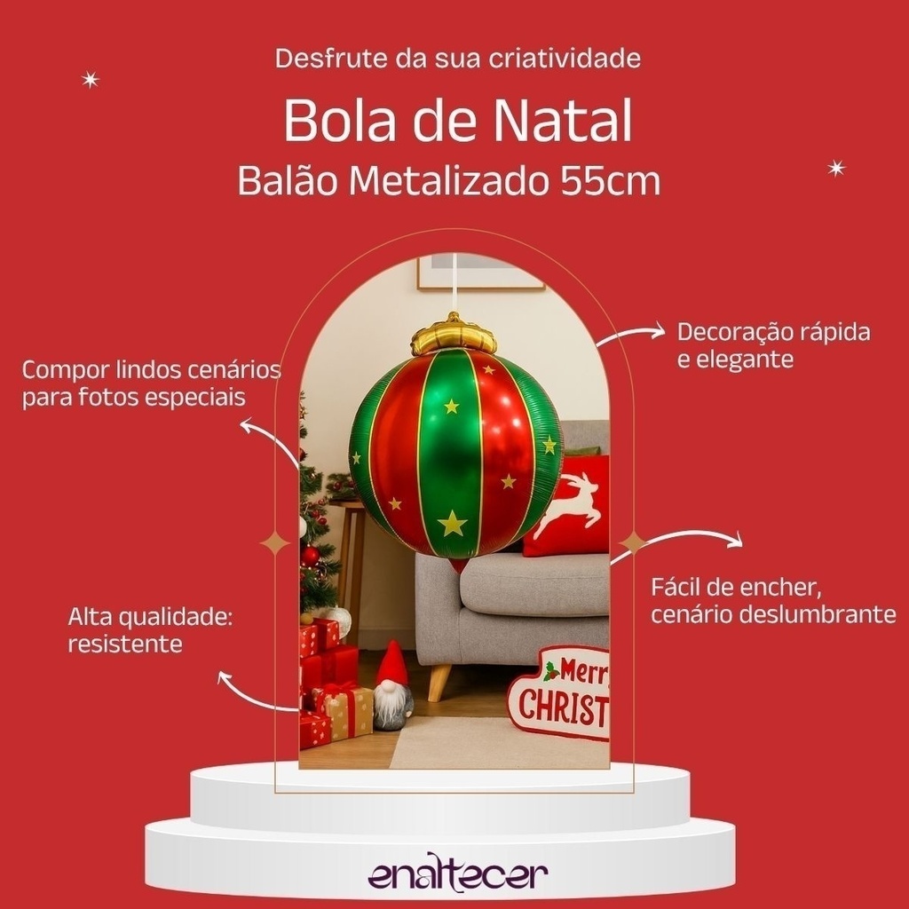Destaque na sua árvore de Natal! Esta linda Bola de Natal Gigante em balão, com 55cm de diâmetro, é o enfeite que vai transformar sua decoração, trazendo um toque de elegância e modernidade.