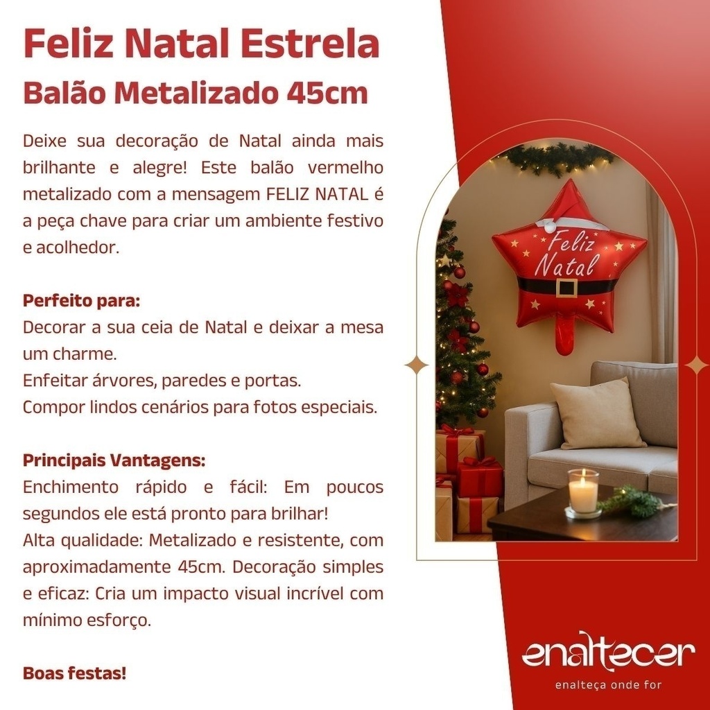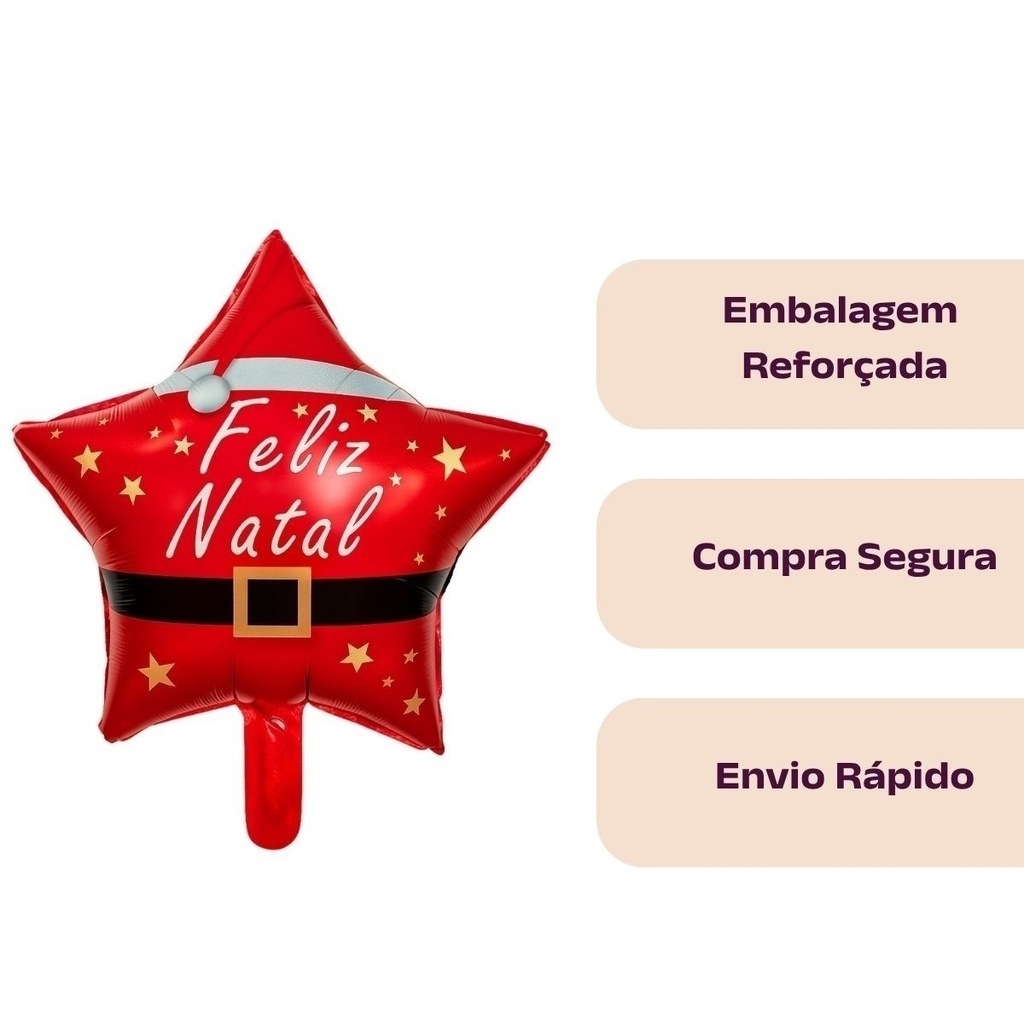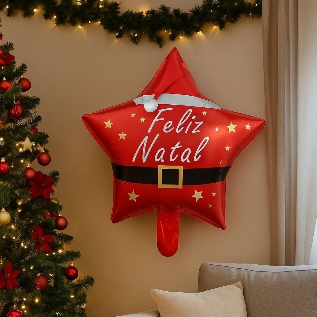 Deixe sua decoração de Natal ainda mais brilhante e alegre! Este balão vermelho metalizado formato de estrela com a mensagem FELIZ NATAL é a peça chave para criar um ambiente festivo e acolhedor.