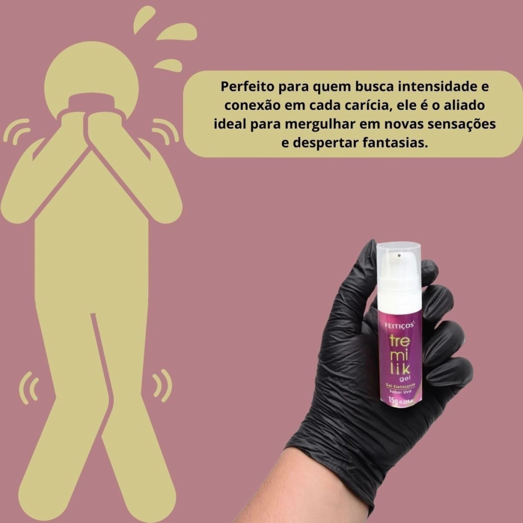 Tremilik Gel é um gel vibrador beijável que instiga o prazer, proporcionando uma excitante e adorável sensação de pulsação e excitação. Por ter textura em gel, seu efeito eletrizante dura por mais tempo, mas com a mesma intensidade do Spray. O Tremilik Gel é produzido com o mais alto padrão de qualidade Feitiços, agora com o frasco Airless, podendo ser utilizado até a última gota do produto, sem desperdício.