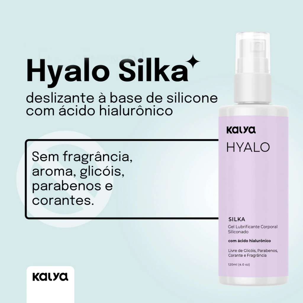 Hyalo Silka é um lubrificante siliconado, com fusão inovadora híbrida (água e silicone), deixando a pele macia. Extremante deslizante, com efeito duradouro, resistente a brincadeiras na água, compatível com preservativo látex, vibradores e ainda tem ação de hidratação profunda por conter ácido hialurônico na sua formação.