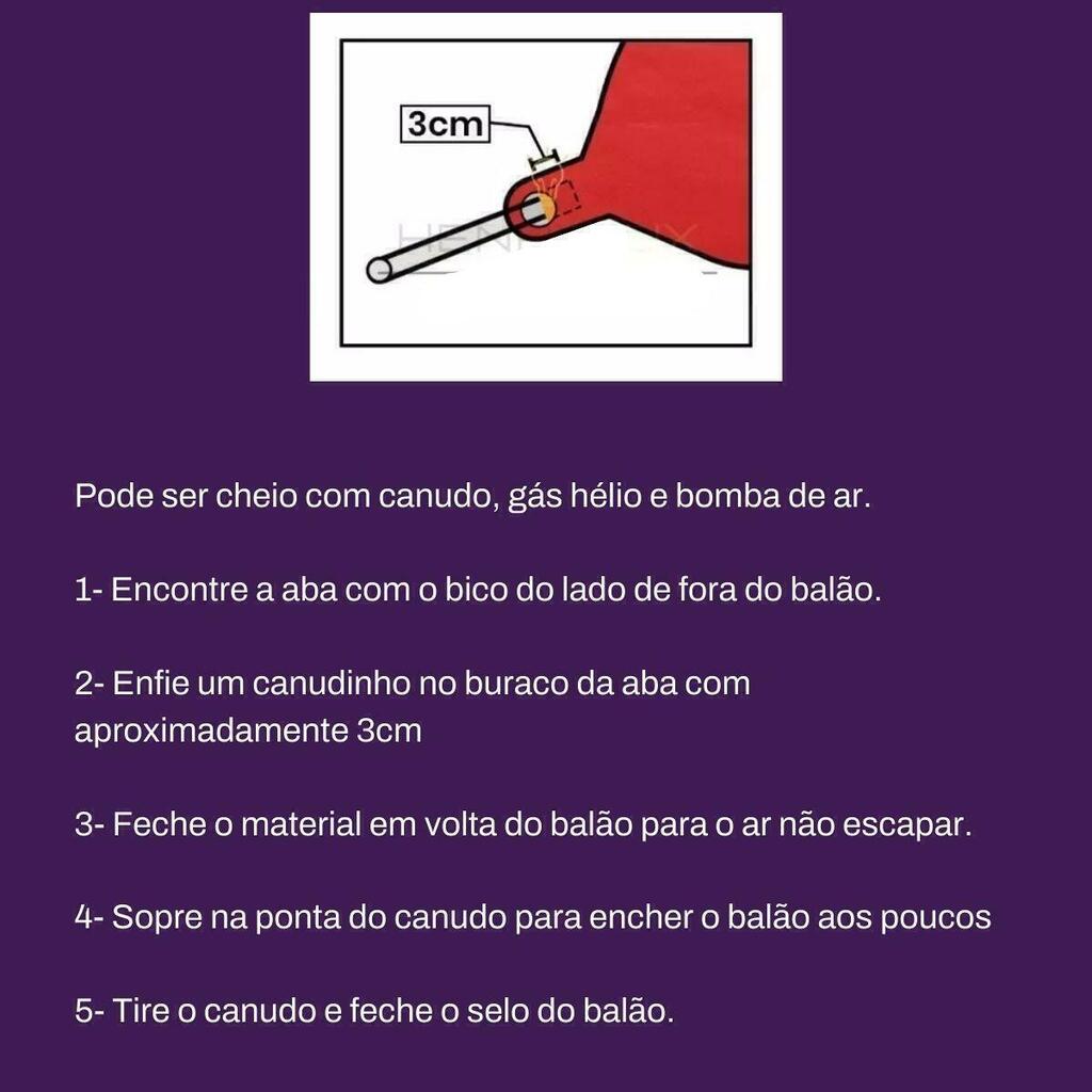 Os balões são enviados vazios. Você poderá enchê-lo utilizando canudo ou com gás hélio. Não acompanha nenhum tipo de fita, prendedor, suporte de balão, palito etc.
